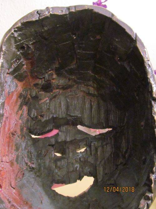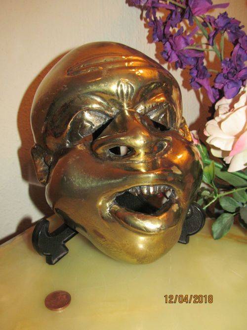 A COLLECTABLE VINTAGE MASK HAND CARVED FROM HEAVY DARK WOOD IN THE INDONESIAN REGION. THE ITEM HAS NATURAL HOLES CREATED ALL AROUND THE BACK FOR STRING ETC WHICH WILL BE USED TO WEAR THE MASK. IT IS POSSIBLE THE MASK IS A REPRESENTATION OF THE BUDDHA.