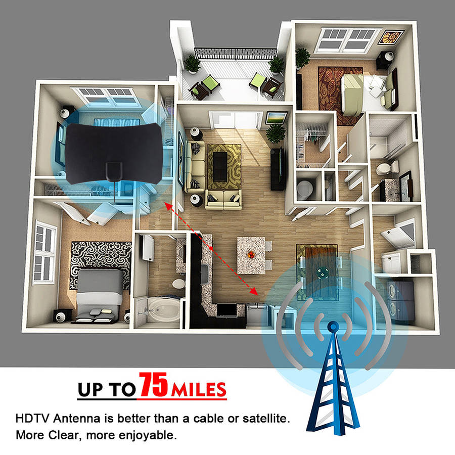 Enjoy crystal clear HDTV shows, 720p, 1080i, 1080p, 4K | ATSC available.This antenna is compatible with all types of TV converter boxes and digital televisions/4K Ultra High Definition TVs. Paper-Thin Design with Detachable Amplifier - Discreet and Ultra thin to match your decor or be hidden out of sight. The Amplifier is included to provide added range and maximum signal reception for more channels if you are far away from broadcast towers. Support 1080P 75 Miles Range Coaxial Cable: 4M Length V.S.W.R.: <=1.5, Max: 1 Impedance: 75Ohm Multi-directional Capability Call out all "Free" channels Gain: 20 dBi (with amplifier) Working Frequency: 174~240MHz, 470~862MHz Size: 210 x 120 x 0.8mm Voltage: 5V Operation Temperature: -45 ~ 85¬トテ Storage Temperature: -45 ~ 85¬トテ