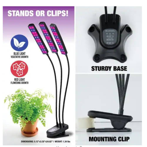 Can stand upright, clip-on or be mounted with the included mounting bracket. The light can be adjusted to blue light, great for vegetative growth, or red light for flowering growth. You can even set a timer so the light automatically shuts off, choose from 3hr, 6hr or 9hrs. Grow your garden at home.