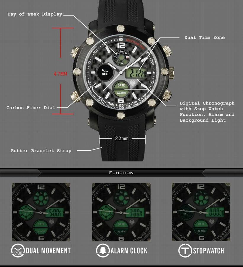 Dual time display (analog+digitals), with green backlight