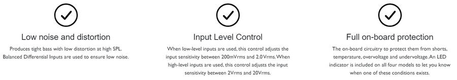 Produces tight bass with low distortion at high SPL. Balanced Differential Inputs are used to ensure low noise.