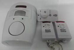 The product comprises of the compact infra-red alarm, with wall mount bracket and two separate key-fob style infra-red remote controls. Batteries are also included.