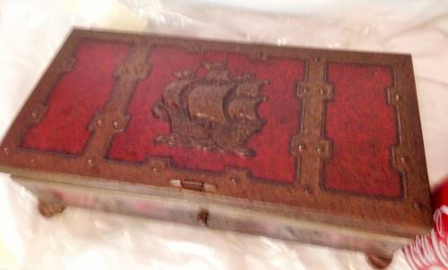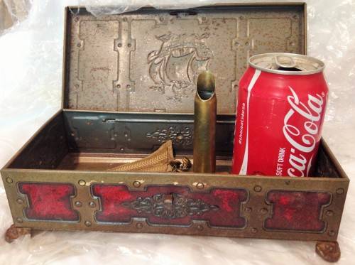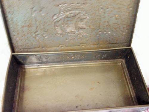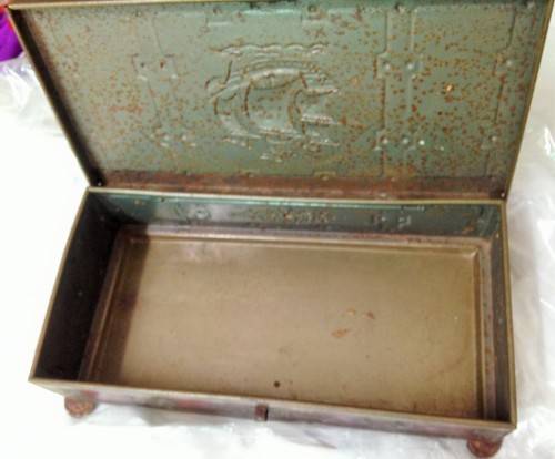 SOLD AS IS IN PICTURE CONDITION - NORMAL AGE AND USE AGE RELATED WARE AND TEAR-DINGS DENTS LOSS OF COATING -RUST- box catch missing on lid LOVELY THINGS