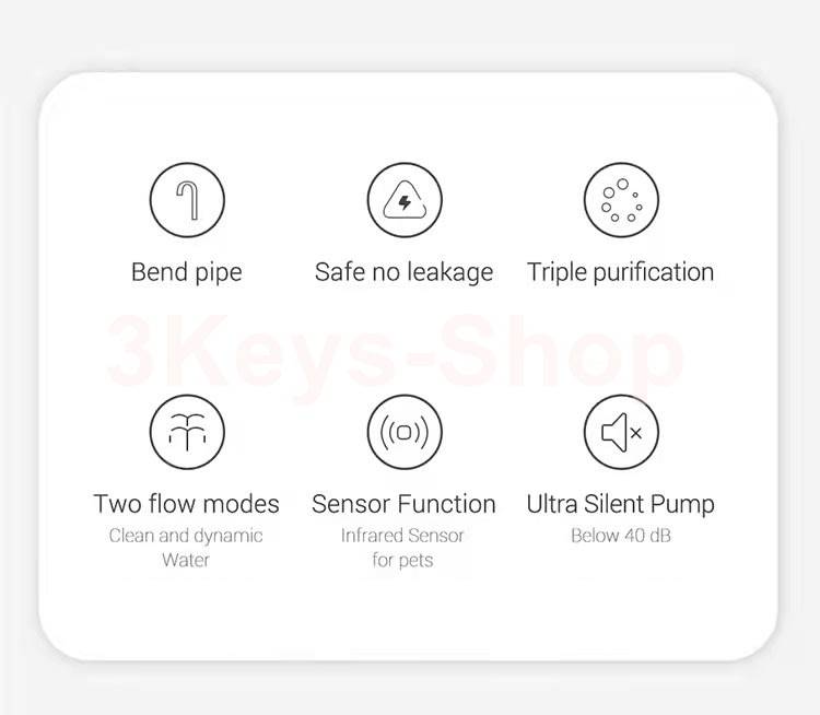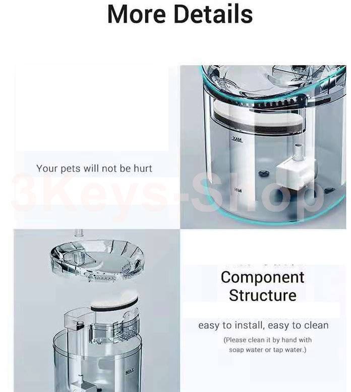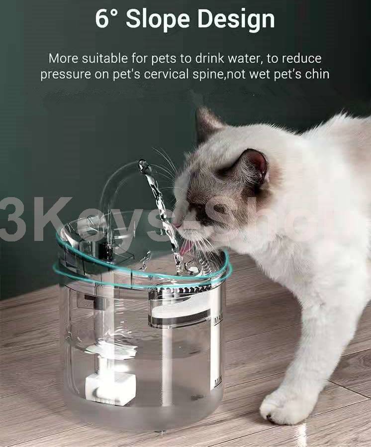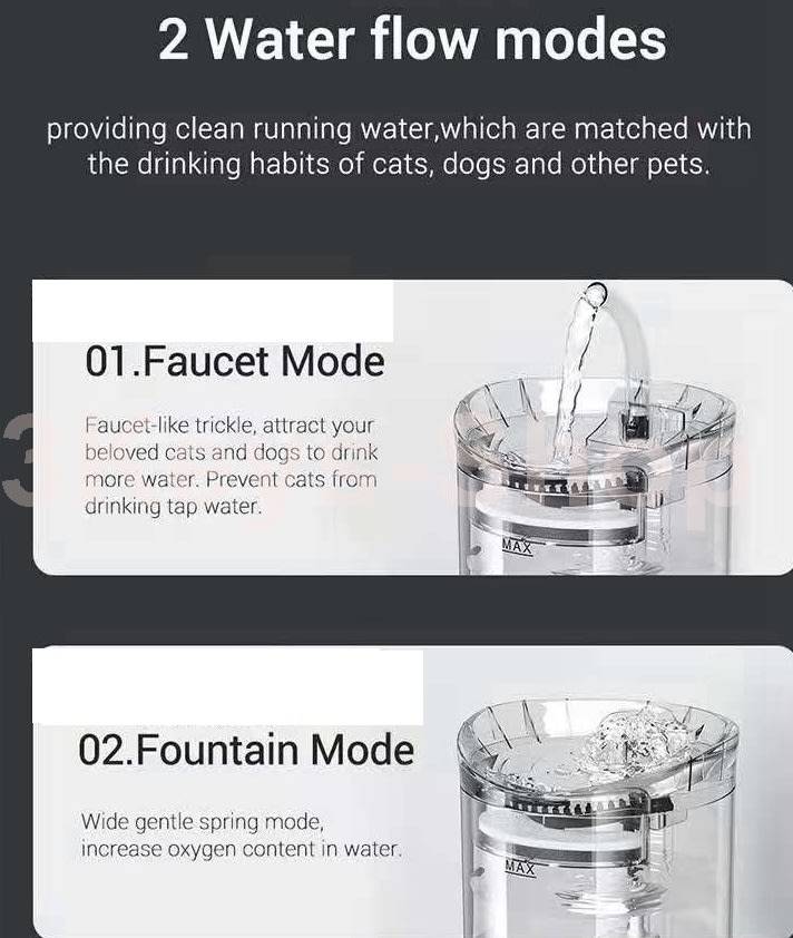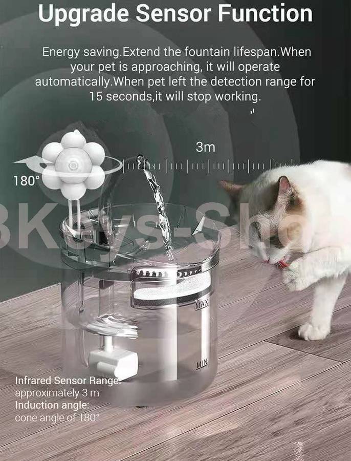 Feature: Automatic Pet Water FountainFully transparent design.2L large capacity is great for dogs, cats, multiple pet households.2 Water flow modes, providing clean running water, make your pets happier and healthier.Product SpecificationMaterial: Food-grade PCItem Color: Fully TransparentMaximum Capacity: 2 liters (67 oz)Item Size: approx. 16.5x16.5x15.5 / 6.5x6.5x6.1in (L*W*H)Filter Replacement Time: Once a month to achieve a good filtering effect. (Replace filter element once every 2 months in intelligent sensor mode)Tips: Clean the pump regularly to extend lifeWarm notes: About the motion sensor, which can be adsorbed on the glossy and smooth surface only, the matte wall or floor does not meet the conditions.