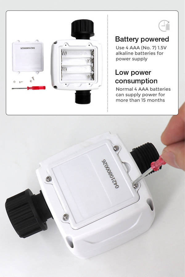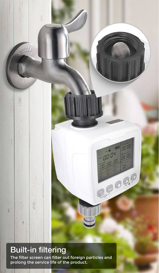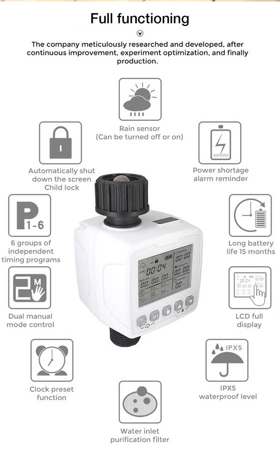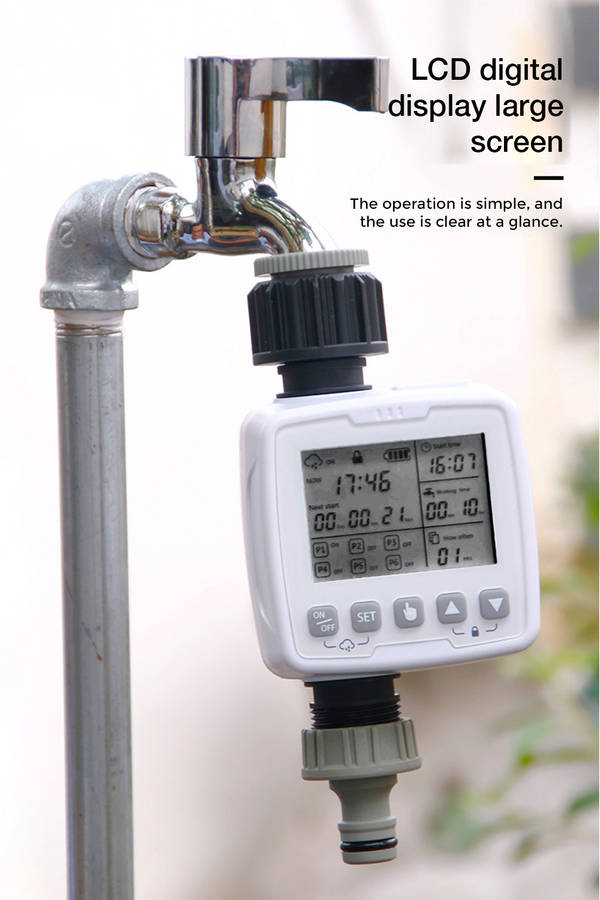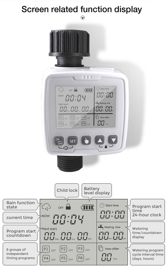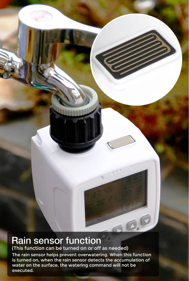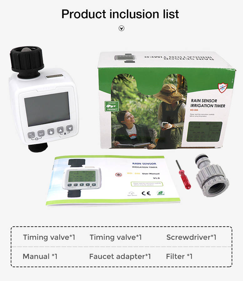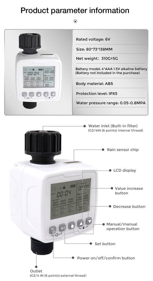 Description : Intelligent Irrigation Timer IPX5 Waterproof Irrigation Controller LCD Screen Display 6 Groups Independent Timing Programs Irrigation Timer with Rain Sensor Features : - The rain sensor helps prevent overwatering. When this function is turned on, when the rain sensor detects that there is water on the surface, the watering command will not be executed. - Large LCD digital display screen, easy to operate, easy to use. - If no button operation is performed within 1 minute, the screen will automatically turn off and the product will enter the sleep state. Press any key to light up the screen again. The system automatically turns on the child lock to prevent accidental touch and even modification of the program. - Manual operations and program settings must be performed in the unlocked state. - When the battery indicator on the LCD screen flashes, the irrigator will automatically shut down soon, please replace with new batteries in time. - You can set 6 groups of independent control programs according to your needs. - Provides two manual watering modes, 1. You can directly open or close the water valve. 2. It can be set to stop the water valve after working for a period of time. - Built-in filter, the filter can filter out foreign particles and prolong the service life of the product. - Low power consumption, normal 4 AAA batteries can supply power for more than 15 months. Specifications :