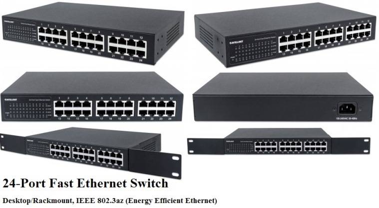 The Intellinet Network Solutions 24-Port Fast Ethernet Switch [Model Number: 560924] is a high-performance 10/100 Mbps LAN switch with auto-sensing and auto-negotiation on every port. The space-saving, cost-effective design allows you to connect up to 24 devices to your local area network while only taking up one slot in your network rack or cabinet.