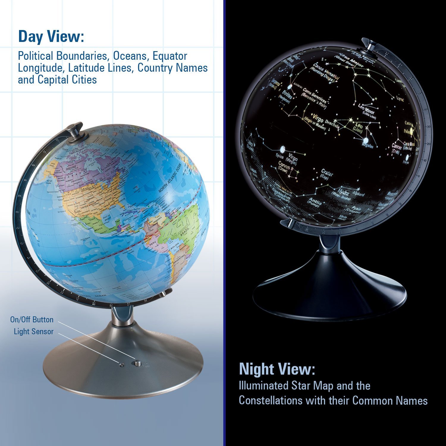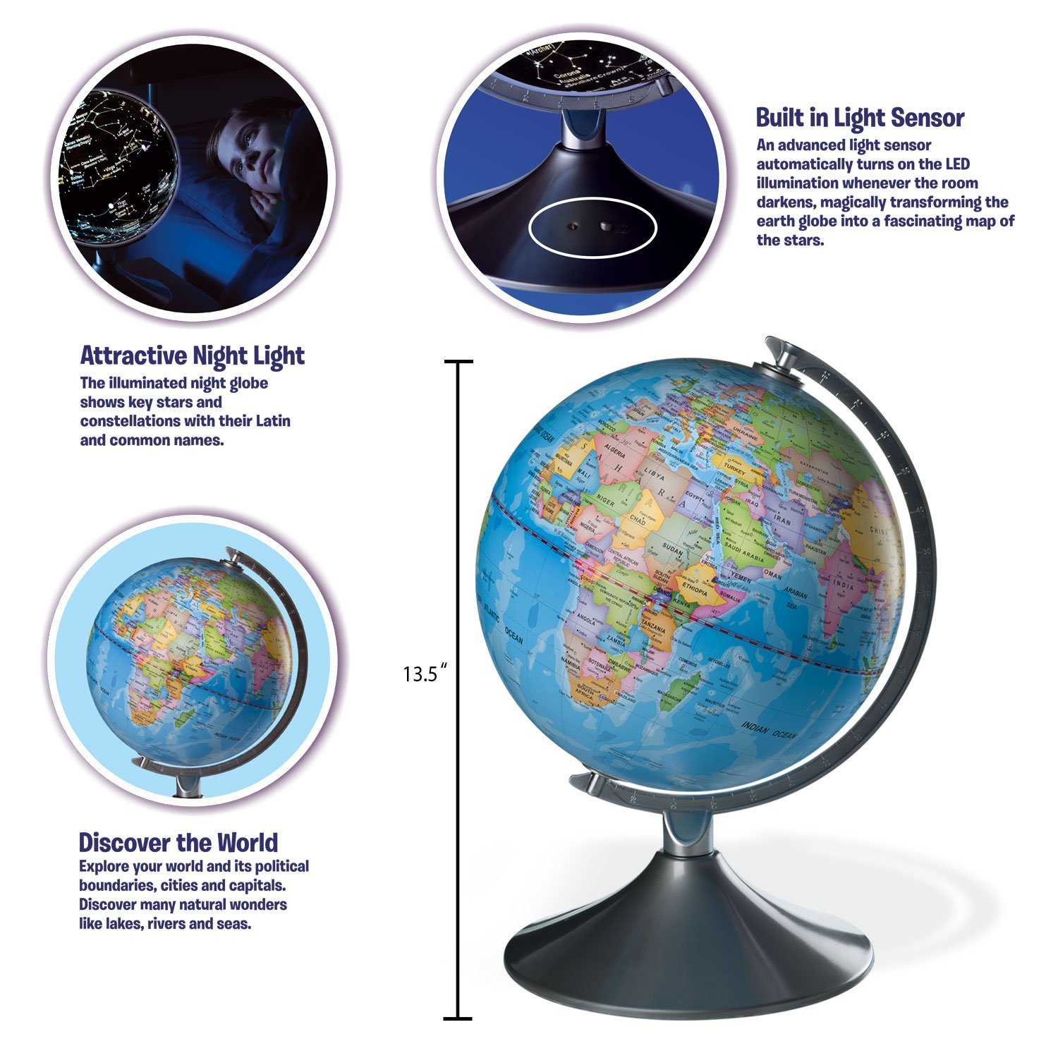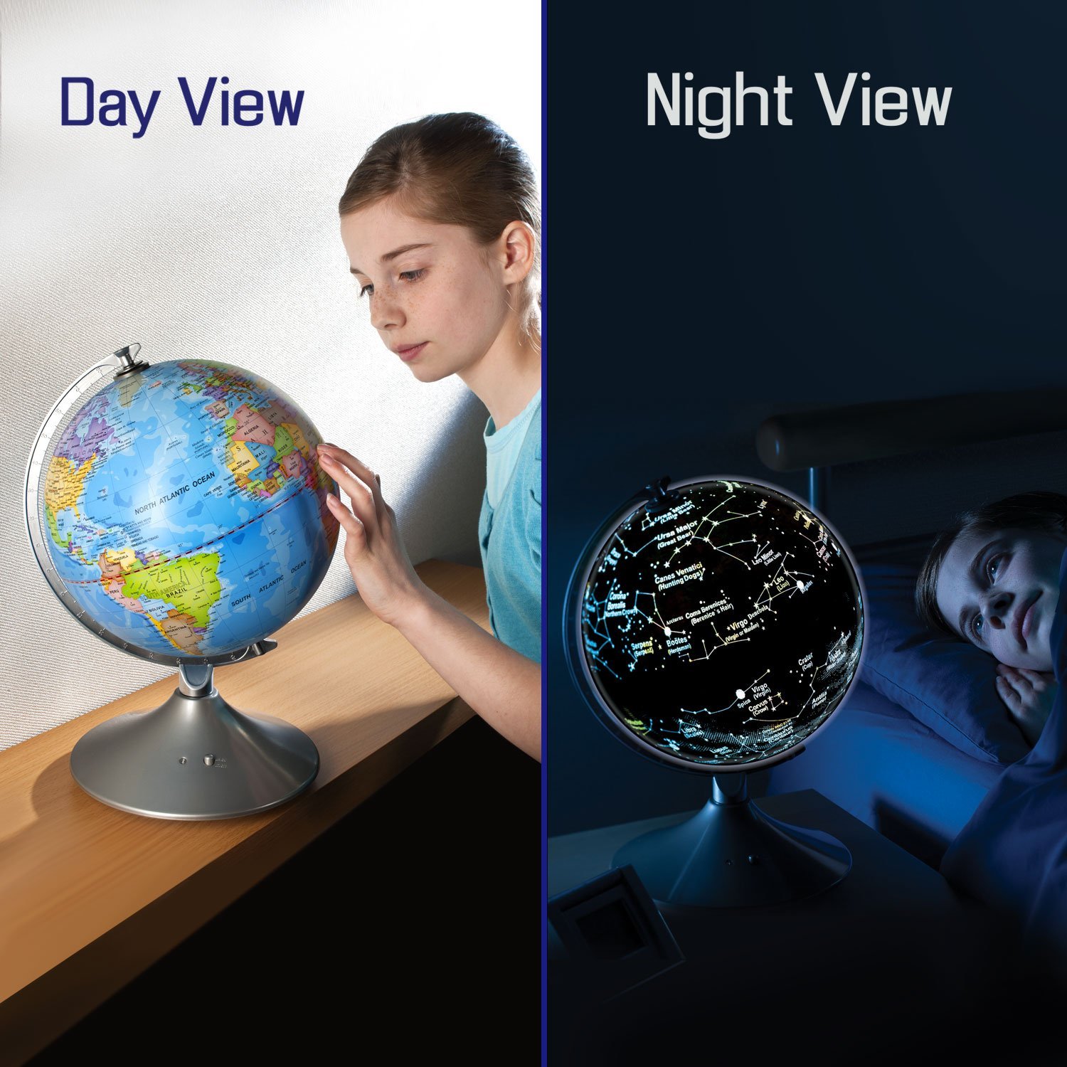 Kids Globe shows planet Earth by day and transforms into a constellation globeat night, Beautiful ¿¿¿Globe Night View¿¿¿ 22.8cm world map showing geographicfeatures by day By night, in a dark room, the illuminated star map showsconstellations with the build-in globe lights Light sensor automatically turnsglobe to night feature when dark. Durable & high quality globe with a strongglobe stand Requires 4 x C batteries (not included). This new Kids World Globewill be the best gift for any child & a beautiful decor in the living room oryour kids bedroom