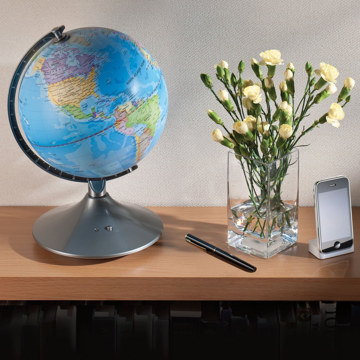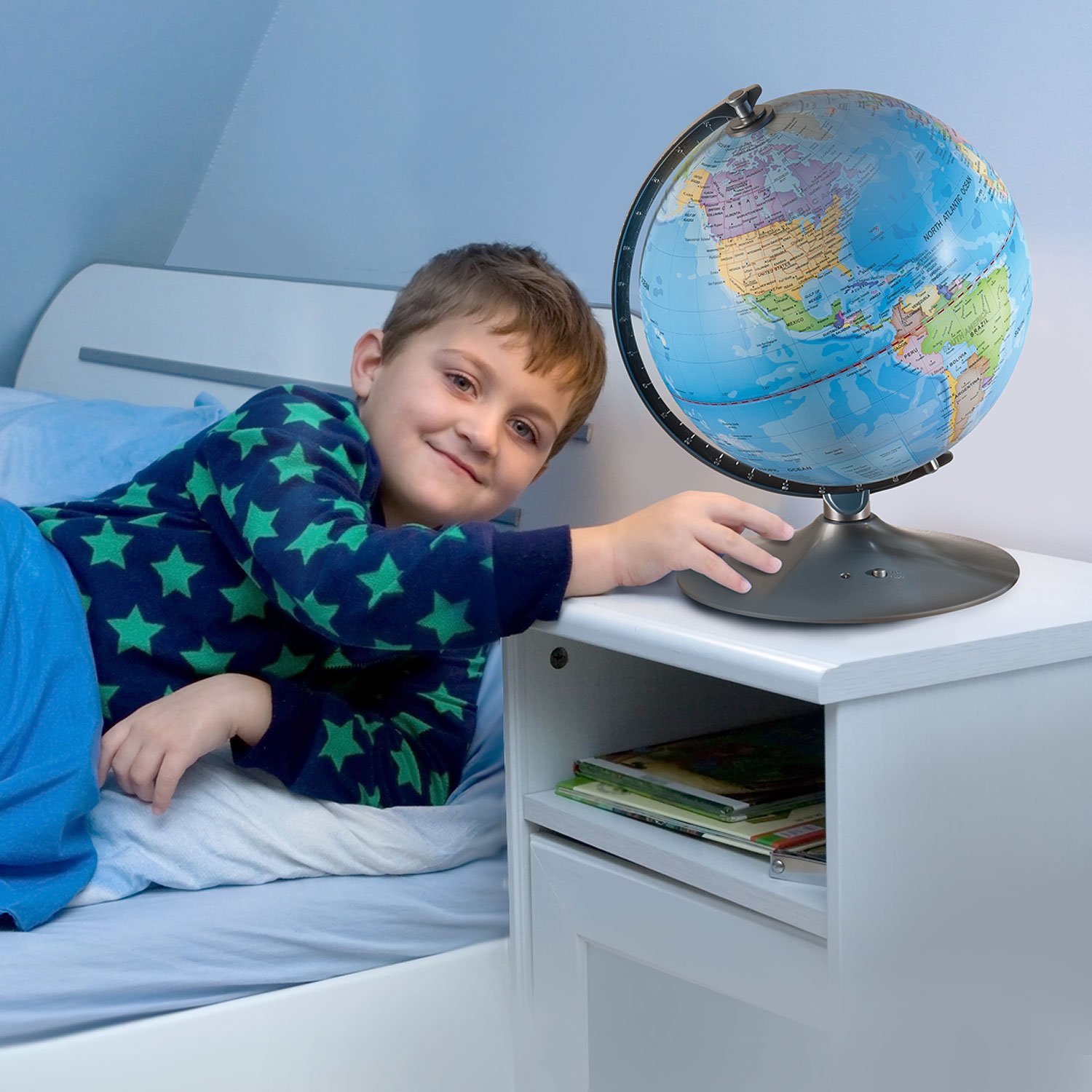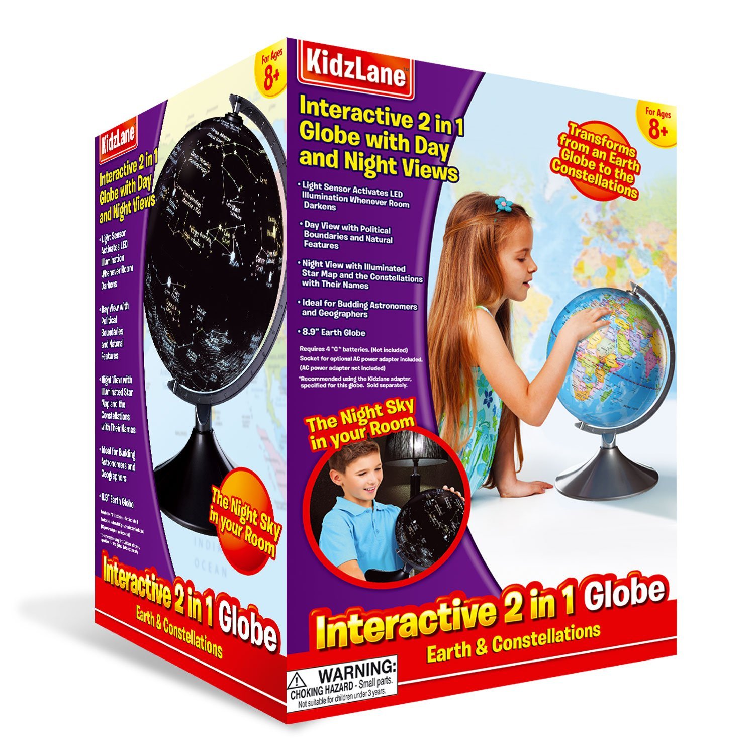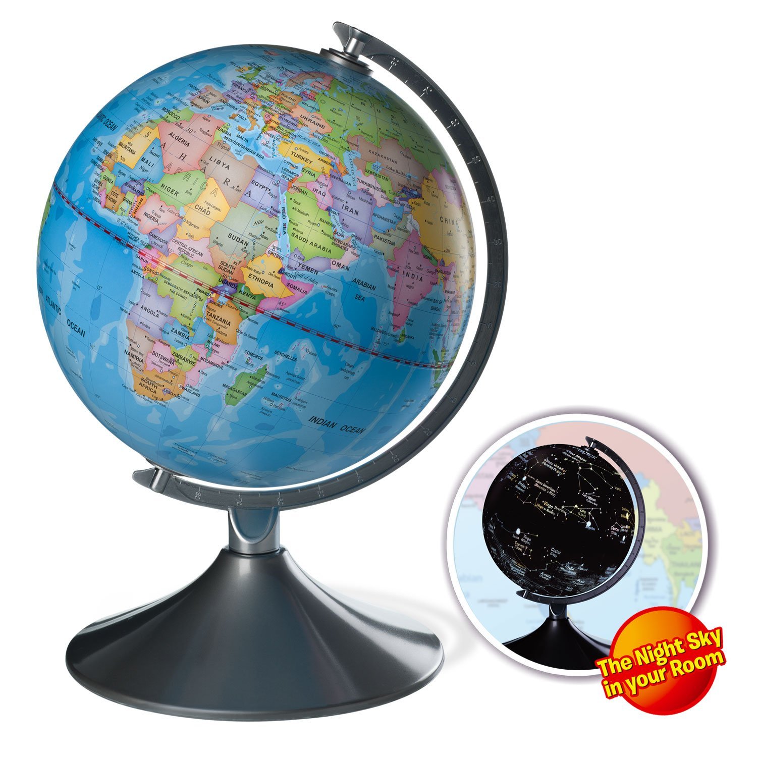 Kids Globe shows planet Earth by day and transforms into a constellation globeat night, Beautiful ¿¿¿Globe Night View¿¿¿ 22.8cm world map showing geographicfeatures by day By night, in a dark room, the illuminated star map showsconstellations with the build-in globe lights Light sensor automatically turnsglobe to night feature when dark. Durable & high quality globe with a strongglobe stand Requires 4 x C batteries (not included). This new Kids World Globewill be the best gift for any child & a beautiful decor in the living room oryour kids bedroom