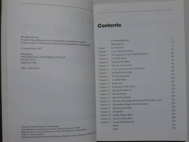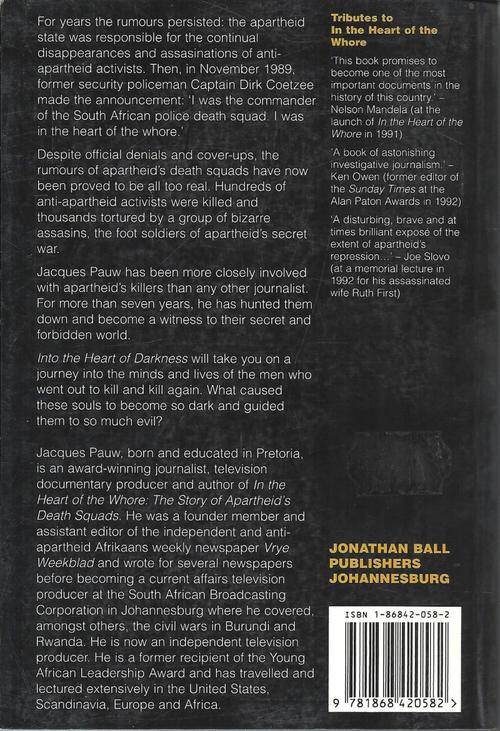 Confessions Of Apartheid's Assassins. Despite official denials and cover-ups, the rumours of apartheid's death squads have now been proved to be all too real. Hundreds of anti-apartheid activists were killed and thousands tortured by a group of bizarre assassins, the foot soldiers of apartheid's secret war. Ground breaking expose written and researched by journalist Jacques Pauw. First edition soft cover published by Jonathan Ball, 1997. 346 pages with index. Illustrated throughout. Very good condition, single vertical spine crease. . A persistent rumour that those implicated in the book tried to buy all available copies might explain why this is such a scarce edition.