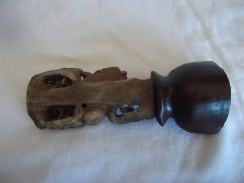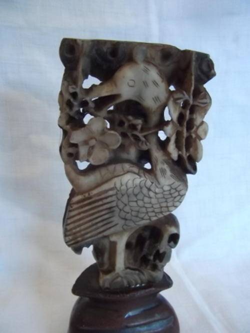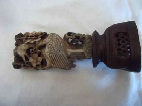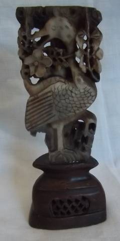 This elaborate chine carving of a bird on a stand is 18 cm long. It has a hollow on the top which looks as if it was meant to be a candle holder. A lovely item in a good condition as seen on the photos. Please note that the one petal on the flower seems to be broken, I think that it happened at the carver or was intentional as the colouring is all the same.