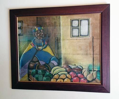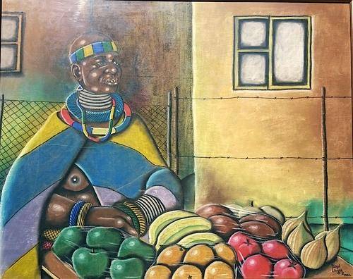Floyd is a self taught artist although he did receive some guidance from Lukas Sithole and Morningstar Motaung. He works mainly in pastel and charcoal, sometimes also in acrylic. His works often depict scenes from daily life in the township. He comments that living in the township assures that he is never short of ideas for subjects. One of the most striking qualities in Floyds work is the originality of his style and his use of bright colours.