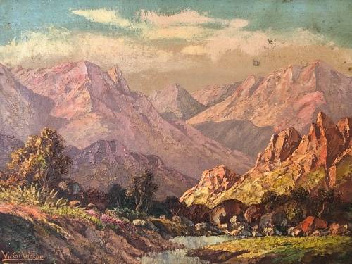 Late Victor Visser from The Strand (Western Cape) where he lived till the early 80's with his wife and four daughters, was a well-known full-time artist in the Cape Province who mainly painted landscapes, and specialized in mountain- and country scenes of the Western Cape . Victor's artworks can be found in collections all over South Africa and even though he kept his life very private his artworks are recognized & sought after by collectors all around the country.Victor is known for schooling some of South Africa's best oil on canvas artists including but not limited to Michael Albertyn who has enjoyed tremendous success throughout his career as an artist, and lately as an international acclaimed artist.