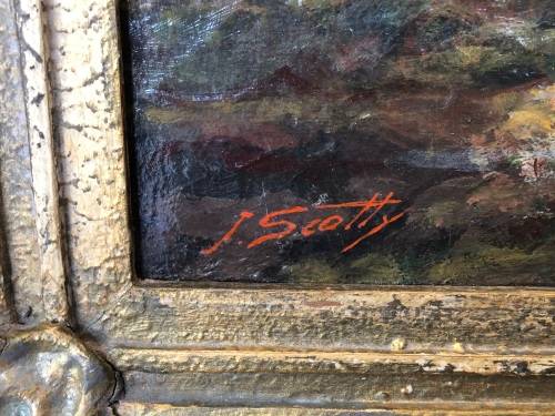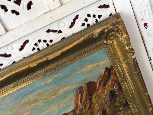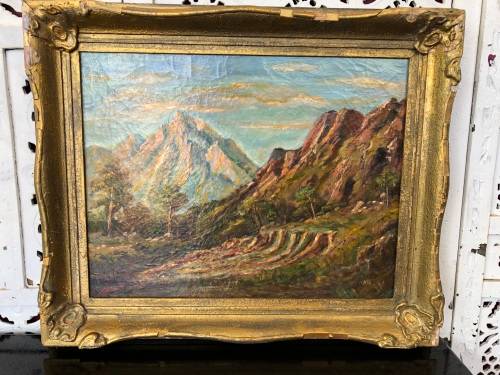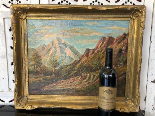 TITTA FASCIOTTI (SA 1927-1993) STUNNING OIL ON CANVAS LANDSCAPE - TITLED ON THE REAR "C.P. SOMEWHERE NEAR STELLENBOSCH" - SIGNED T. SCOTTY - FRAMED IN A STUNNING VINTAGE FRAME - FRAME HAS A FEW NIBBLES AS PER PHOTOS - A SIMILAR PAINTING SOLD ON STRAUSS FOR R28000