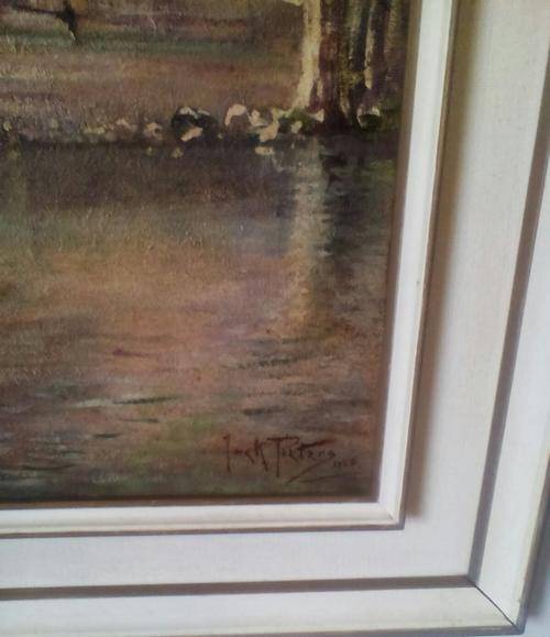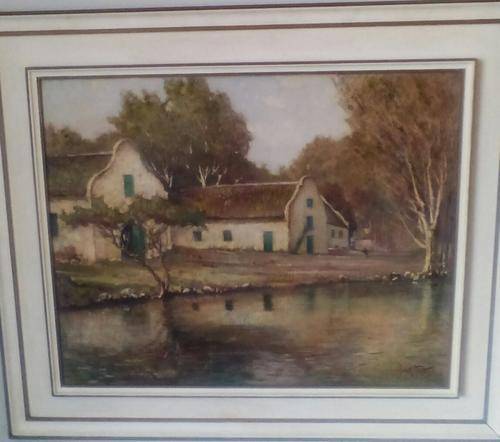 Skillfully executed oil painting on board by Jack Pieters. Depicting a farmhouse by the edge of a pond. Entitled to rear 'Klein Welmoed, near Stellenbosch' Price in 1968-r400! Signed and dated to front right hand corner. Painting alone measures 750mm ×600mm.In good condition. Frame has some wear and tear.