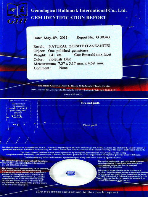 Buying high quality certified tanzanite only found in the foothills of Kilamanjaro in Tanzania with only a decade of supply still available is an investment opposed to all the inferior quality available on the market. This Tanzanite is certified by the Gemological Hallmark International Co. and comes sealed inside the certificate for authenticity.