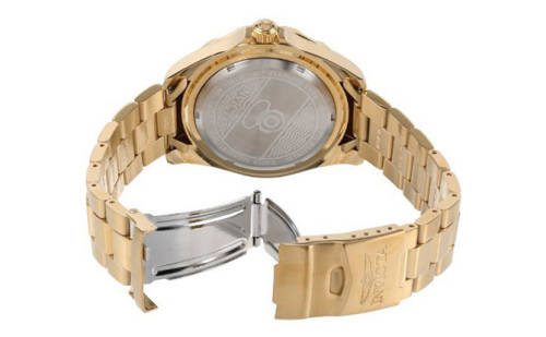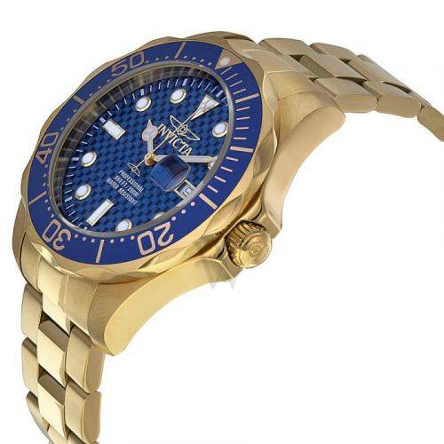 Gold ion-plated stainless steel case and bracelet. Uni-directional rotating gold ion-plated bezel with blue top ring. Blue carbon dial with luminous gold-tone hands and dot hour markers. Minute markers around the outer rim. Dial Type: Analog. Luminescent hands and markers. Date display at the 3 o'clock position. Quartz movement. Scratch resistant mineral crystal. Pull / push crown. Solid case back. Case diameter: 47 mm. Case thickness: 14 mm. Round case shape. Band width: 22 mm. Band length: 8.65 inches. Fold over clasp with a safety release. Water resistant at 200 meters / 660 feet. Functions: date, hour, minute, second. Casual watch style. Invicta Pro Diver Blue Cabon Dial Gold Ion-plated Mens Watch 14357.