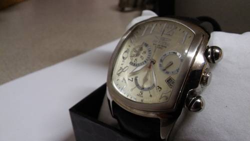 Extra over size. Almost new condition. An expensive, but beautiful piece. Moon domed, magnifying crystal. Champagne dial. New Swiss Renata Battery. Comes in a gift box. First 2 pics show the true color of the dial. In the other pics the numerals are blackish due to reflection of black smartphone. Free Shipping.