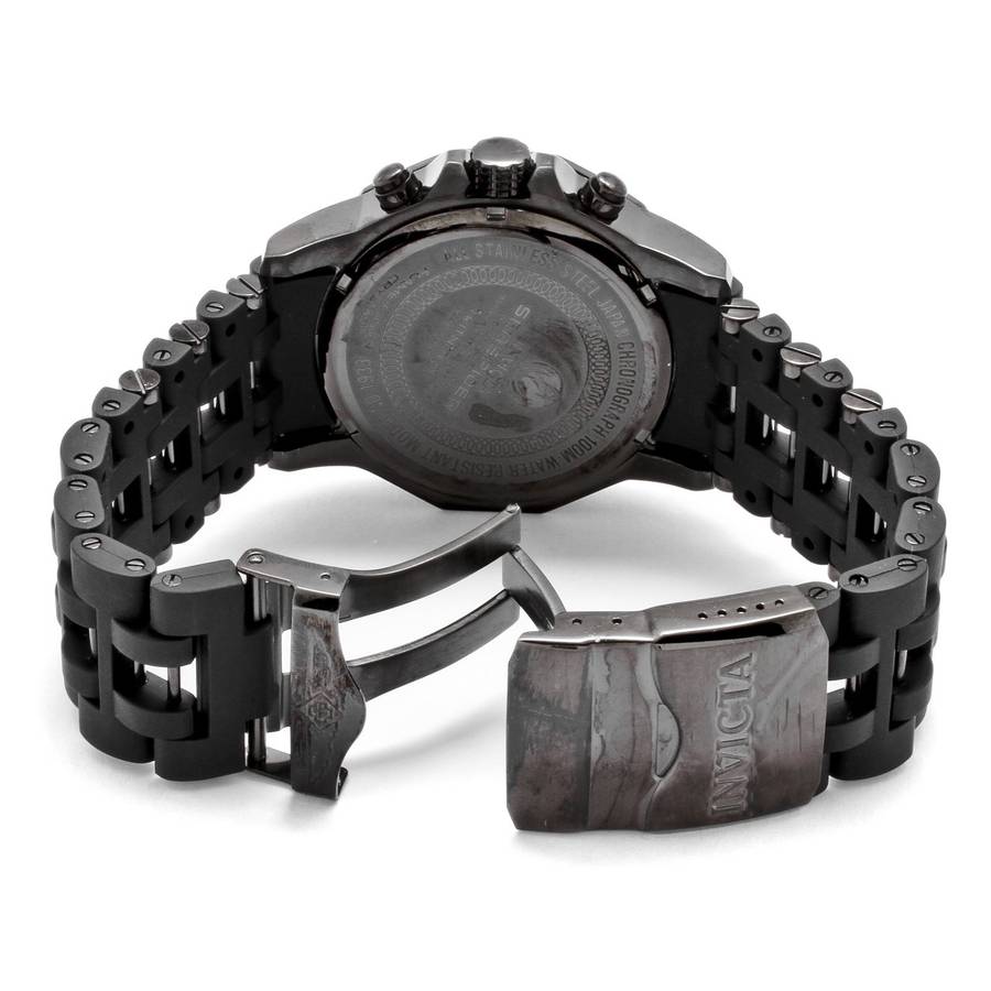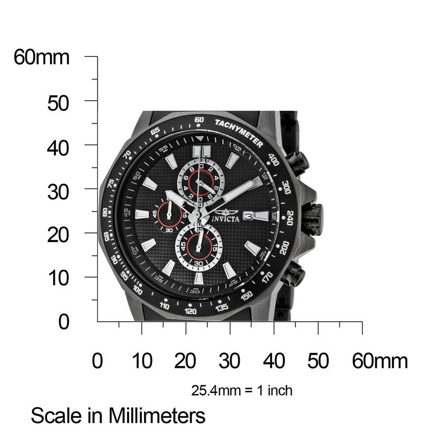 Brand Name Invicta Part Number 1933 Item Shape Round Dial window material type Flame-Fusion Display Type Analog Clasp Buckle Case material Stainless steel Case diameter 48 millimeters Case Thickness 14 millimeters Band Material Polyurethane Band length Men's Standard Band width 26 millimeters Dial color Black Bezel material Stainless steel Bezel function tachymeter Calendar Date Movement Japanese quartz Water resistant depth 330 Feet