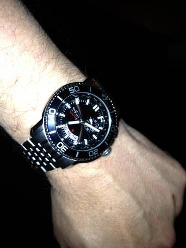 Precision Swiss quartz movement with scroll date display and seconds sub dial. Black dial with polished steel hour/minute/GMT/second hands. Luminous inserts on hands and markers for night time visibility. Scroll date display at 5-7 o'clock. Surgical stainless steel case with screw in stainless steel case back. Unidirectional elapsed time bezel with silver markings on black. Scratch resistant flame fusion crystal glass. Water resistant to 100m/10bar.