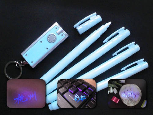 with its colourless and solvent based invisible ink, it is suitable for writing and marking on almost all surface. As well as being suitable for domestic use, this special pen is also ideal for use in bank, antique, court and night pub.