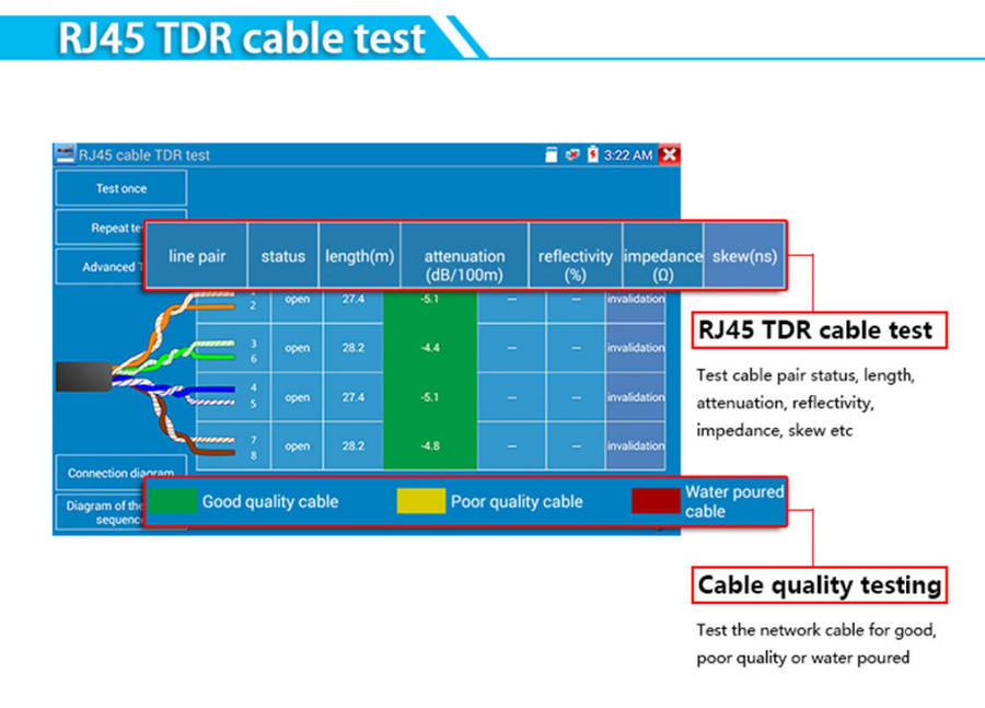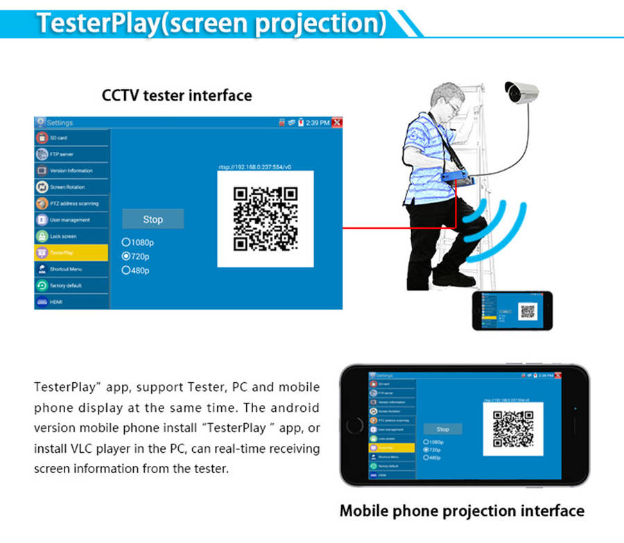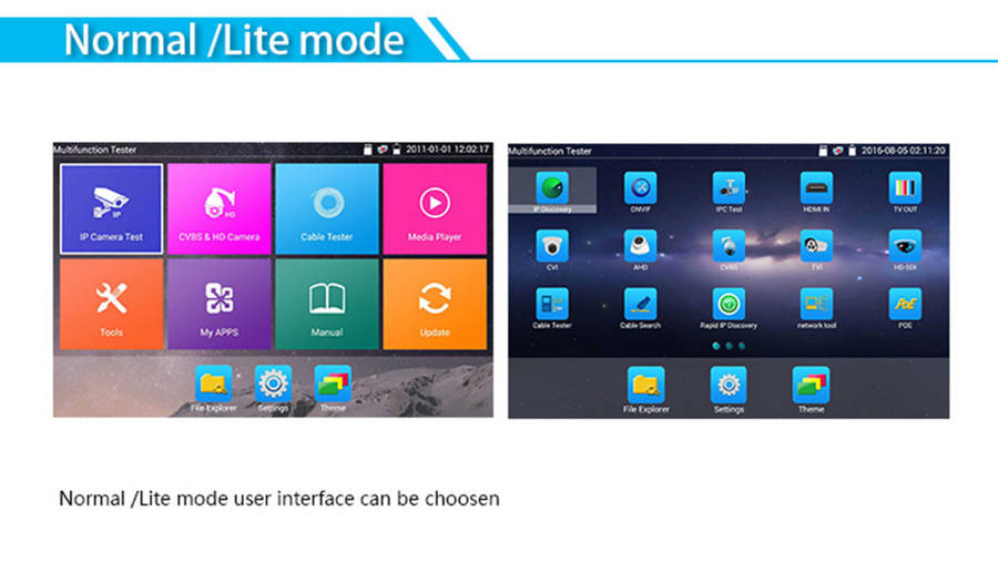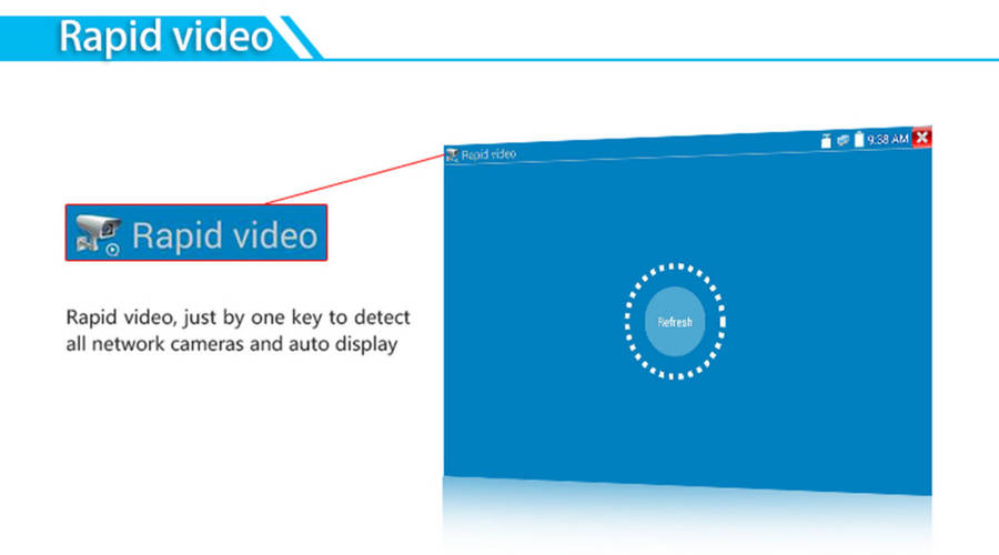 Description: IPC-9800 Plus Camera test: ● 7 inch IPS touch screen, 1920*1200 resolution ● H.265 & H .264 IP, 4K video display via mainstream ● Rapid ONVIF, Auto log in & display image, create testing report ● AXIS, Hikvision camera test, enter ONVIF app, input username and password to test ● CVBS camera test and PTZ control ● IPC TEST (Non-ONVIF test), HIK test tool (Hikvision camera),DH test tool (Dahua camera) ● Video level meter, peak video signal level, SYNC signal level, Colorful bar chroma level measurement* ● DC12V/3A power output, camera can be powered from DC 12Votage ● 48V PoE power output power ● Rapid video, just by one key to detect all network cameras and auto display ● Built in Wi-Fi, display image from the wireless camera, create WIFI hotspot ● CVBS loop test, the tester send and receive colorful bar generator signal, to check BNC cable ● Enhanced colorful bar generator, PAL/NTSC multi-system colorful bar video generator Cable test: ● Improvement cable tester, UTP cable, telephone cable etc order and connectivity test, can save testing report, if special number, need customized ● RJ45 cable TDR test, test cable pair status, length, attenuation, reflectivity, impedance, skew etc Other functions: ● Network tool: Ping, IP scan, Port Flash, DHCP server, Trace Route ● POE & power information, DC12V& PoE power and voltage output /input measurement ● Tester Play: Tester, android version mobile phone and PC display at the same time ● Shortcut button, drop-down menu, can select Poe power, IP setting, CVBS, LAN info, HDMI IN etc ● Traffic monitoring, display network port or WIFI connection real-time upload and download speeds and other network parameters ● Self -update software, you can install apps with android version ● Media player, 4K video files and MKV/MP4 media files play ● Quick office, quick office app (support excel, word, ppt format) doc. editable ● 8GB SD card including ● Display its genuine resolution of the IP camera images ● Audio in, support record and save the audio/LED lamp, calculators, music players and other application tools ● 7.4 V /7500mAh Lithium Ion Polymer Battery, after 5~6 hours charging , working time lasts 10 hours