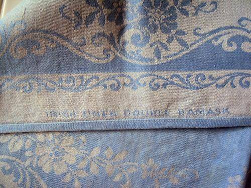 Stunning Irish Linen Double Damask pale blue tea cloth or table top decor, 2 sides hemmed, 2 sides selvage.