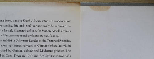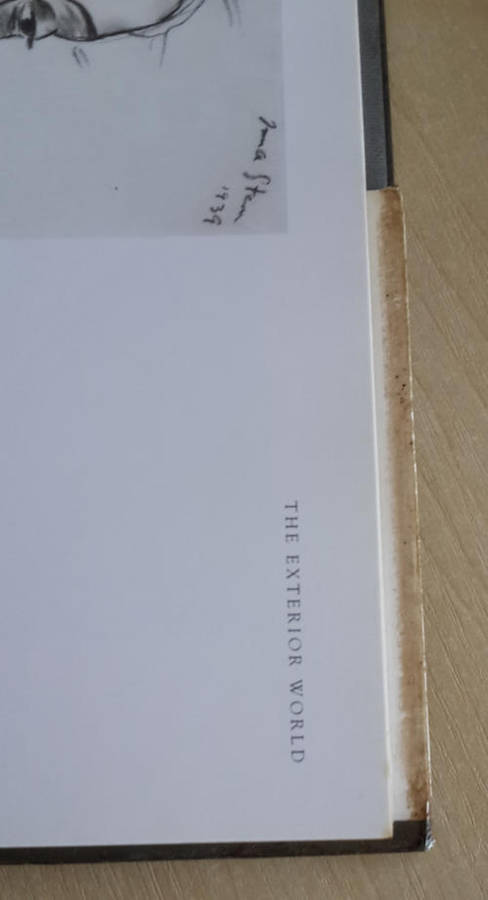 Dustwrapper a bit worn and dented. Something has been spilt on it, that can be wiped off, but it has made the top corners of some of the pages a bit sticky, staining to boards (see images). Some foxing. Previous owners name on FEP.