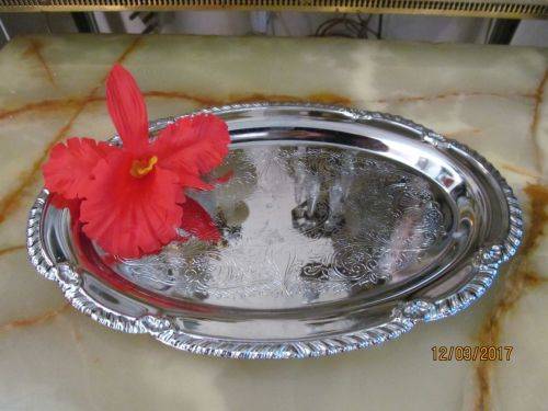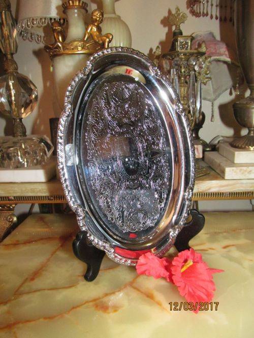 A Beaded pattern along a scalloped rim interspersed with a gorgeous raised shell design and detailed engravings consisting of a fern, scroll and fan motif are what sets this BEAUTIFUL Oval shaped Tray/Dish apart. Add the Mirror finish of the gorgeous Chrome plating and a CLEAR cartouche portion in the center for an engraving of YOUR choice.....and you have PURE EXQUISITE STYLE.