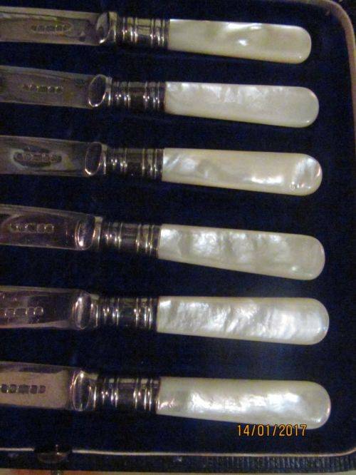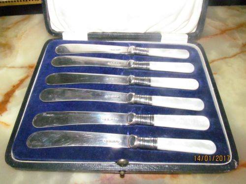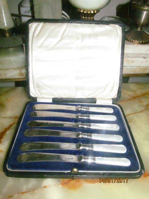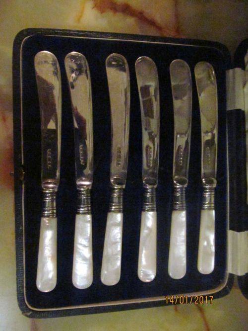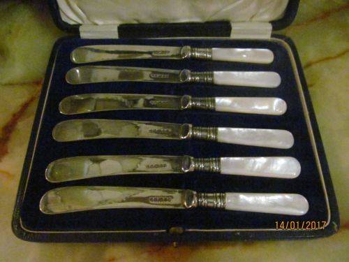 An Absolutely immaculate and well looked after set of Six Antique Butter knives with Mother of Pearl handles and Silver Plated Ferrules attaching stainless steel blades to Mother of Pearl handles. The Set comes in its ORIGINAL Box which is covered in a Black Leatherette material and has a SILK inner lining on the inside of the Lid and Blue Velvet Lining with recesses for the Set to fit comfortably. The box opens and closes by means of a brass spring clip mechanism and is hinged.