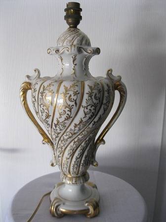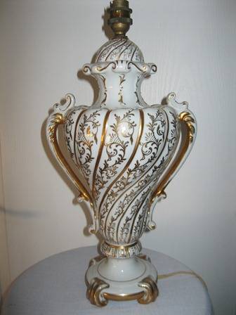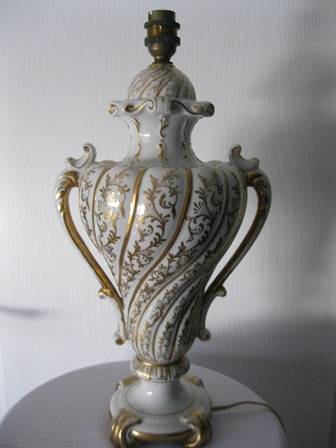 You are bidding on a Italian Style Ceramic table Lamp urn style in gold and white that works perfectly all in needs is a lampshade, the lampbase stands 41cm tall x 20cm and is decorated in gold swirls and leaves.
