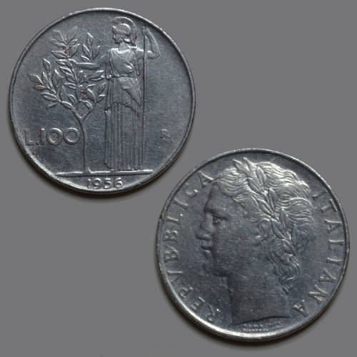 Italy 100 lire 1956 Coin - Obverse - GIAMPAOLI INC. / REPVBBLICA ITALIANA / ROMAGNOLI - Reverse L.100 / R - Stainless Steel