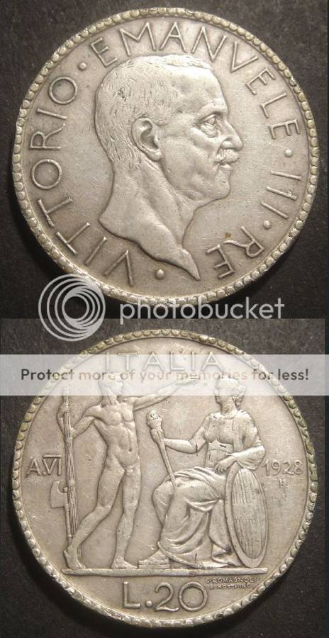 Italy : SILVER 20-Lire of 1928R (Vittorio Emanuele III) : RARE