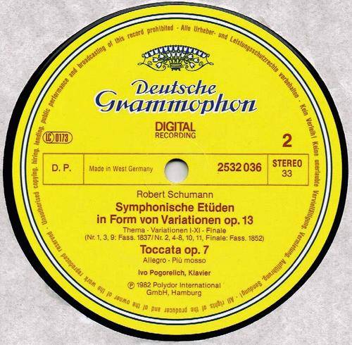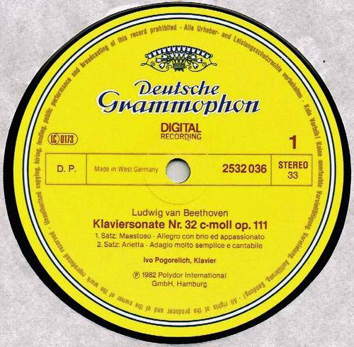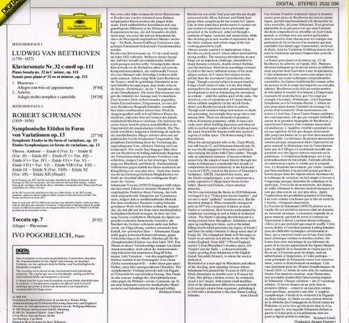 1982 German DEUTSCHE GRAMMOPHON DIGITAL Recording pressing, release number 2532 036, of album LUDWIG VAN BEETHOVEN: Klaviersonate Nr. 32 c-moll op. 111 - Piano Sonata no. 32 in C minor, op. 111 - Sonate pour piano n° 32 en ut mineur, op. 111 / ROBERT SCHUMANN: Symphonische Etüden in Form von Variationen op. 13 - Symphonic Etudes in the form of variations, op. 13 - Etudes Symphoniques en forme devariations, op. 13 / Toccata op. 7: IVO POGORELICH, Piano. The track details are as shown on the images provided. The record is in a hardly played, near mint condition. The cover has very lightly scuffed corners and edges, light edge crinkles, plus there is a small & negligable patch of moisture discolouration at the lower right corner, otherwise in a very good plus shape. |