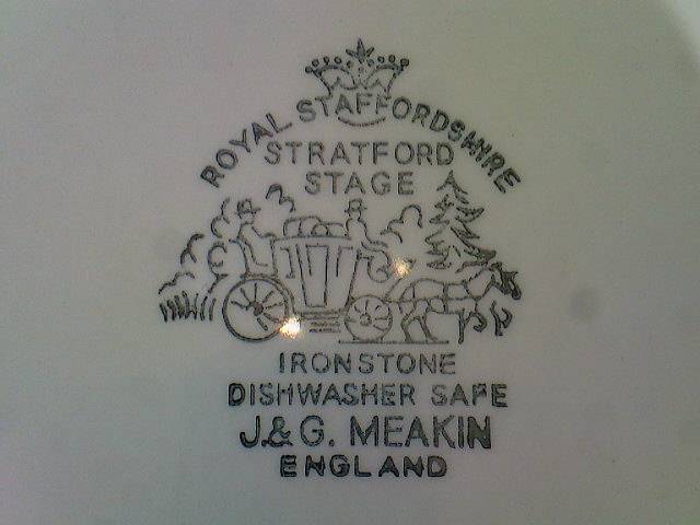 From J&G MEAKIN (ROYAL STAFFORDSHIRE), this OPEN VEGETABLE BOWL in the brown Stratford Stage pattern, which depicts a town scene with coach. The bowl has a scalloped edge and a brown floral rim.