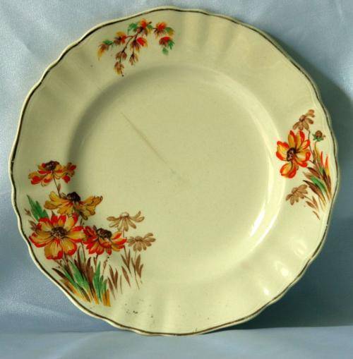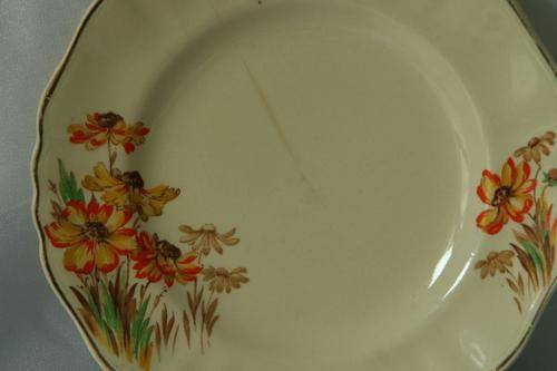 On offer is a J&G Meakin side plate in the 'Sunshine' pattern measuring 175mm. It has no chips but it does have cracks at 9am and 11am. No crazing though. Pattern wear is low, cutlery wear is low and the trim gets a rating of 2-3/10. Have a look at the gallery.