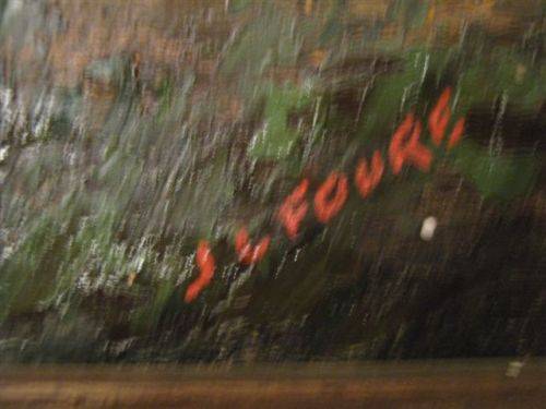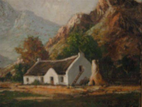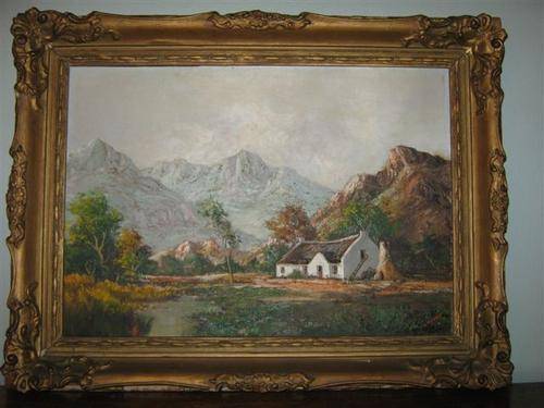 A REALLY BEAUTIFUL, VINTAGE PAINTING OF A MOUNTAINSCAPE FEATURING A CAPE DUTCH HOMESTEAD AND HAS A RIVER IN THE FOREGROUND. THIS WELL KNOWN ARTIST J.L.FOURE WAS A STUDENT OF TINUS DE JONGH. THE PAINTING IS AN OIL WHICH IS FLAKING IN PLACES, MOSTLY THE MOUNTAIN AREAS. THE IT HAS BEEN PAINTED ON BOARD AND IS FRAMED, THE FRAME HAS SOME DAMAGE. THE SIZE OF THE PAINTING IS LENGTH 34.5 CM, AND THE WIDTH 49.5 CM. SIZE INCLUDING FRAME IS LENGTH 48CM, AND WIDTH 63.5CM.