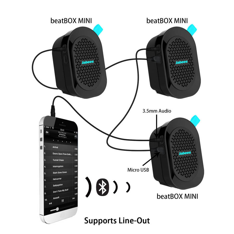 5. Line Out Function, allows you to plug multiple beatBOX MINI speakers in a daisy chain or other speakers simultaneously to stream music.