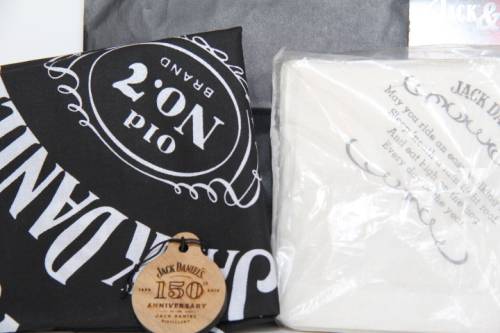 Jack Daniels paper bag 150thanniversary,wooden 150th tag,Table cloth 54cmx54cm,pack of serviettes and Jack&Coke cardboard flyer.Please note does NOT include a bottle.