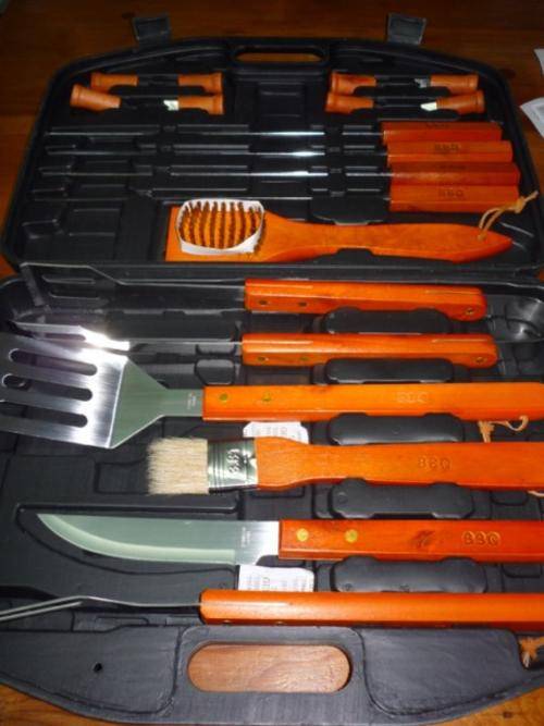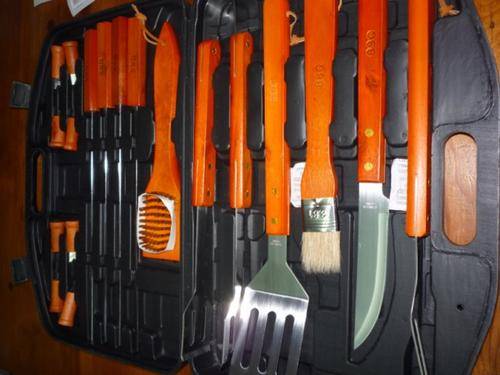 INCLUDES: SPATULA / TONGS / FORK / PIG BRISTLE PASTRY BRUSH / GRILL BRUSH / KNIFE / 4 SKEWERS / 8 CORN COB HOLDERS / CASE
