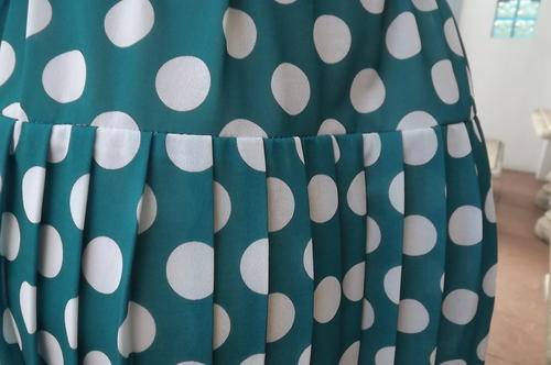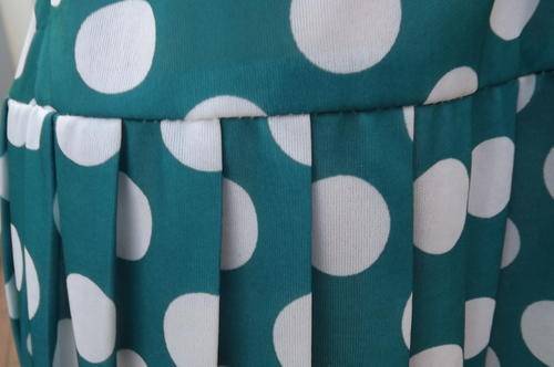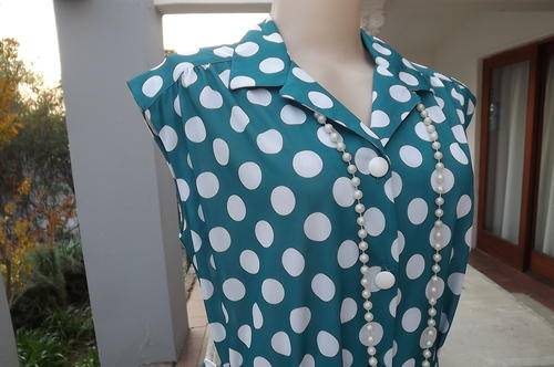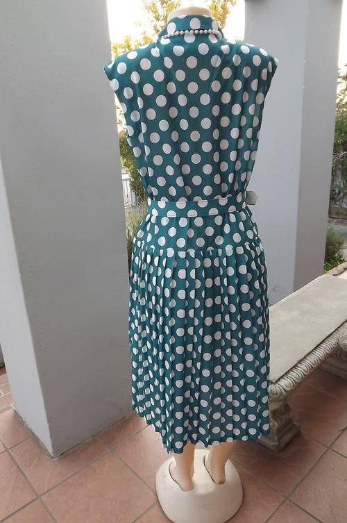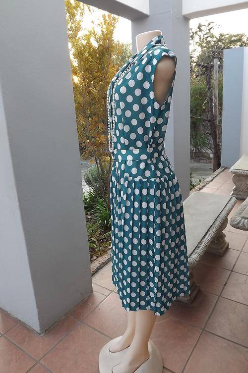 Jade polkadot summer drop waist polyester dress with belt by Tory Fashions size 38/14.Sleeveless with gathering on shoulders front.Collar with button down front.Knife pleats on skirt.Wash & wear fabric.As new