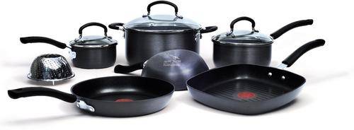 T-fal Jamie Oliver 10-Piece Nonstick Cookware Set is a complete cooking collection that addresses most of your cooking needs. T-fal hard anodized material can withstand use from metal utensils, while the thermo spot technology tells you when the pan is perfectly preheated. Heat channels on the underside of the non-stick set ensure even heat flow along the circumferential area of the vessel. The set is comprised of a Dutch oven, two covered saucepans, two saute pans, a square grill pan and a vegetable steamer. Glass lids are provided for the Dutch oven and saucepans. These lids help retain the moisture and nutrients while cooking. A vent on the lid prevents food from boiling over. Furthermore, the durable non-stick interior utilizes less oil than is otherwise necessary. Ergonomically designed, strong and sturdy silicon handles provide a comfortable grip. You can also just wipe the cookware clean with a soft cloth or paper towel as opposed to a rough scrub.
