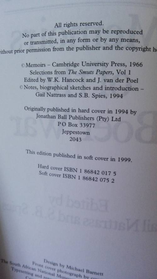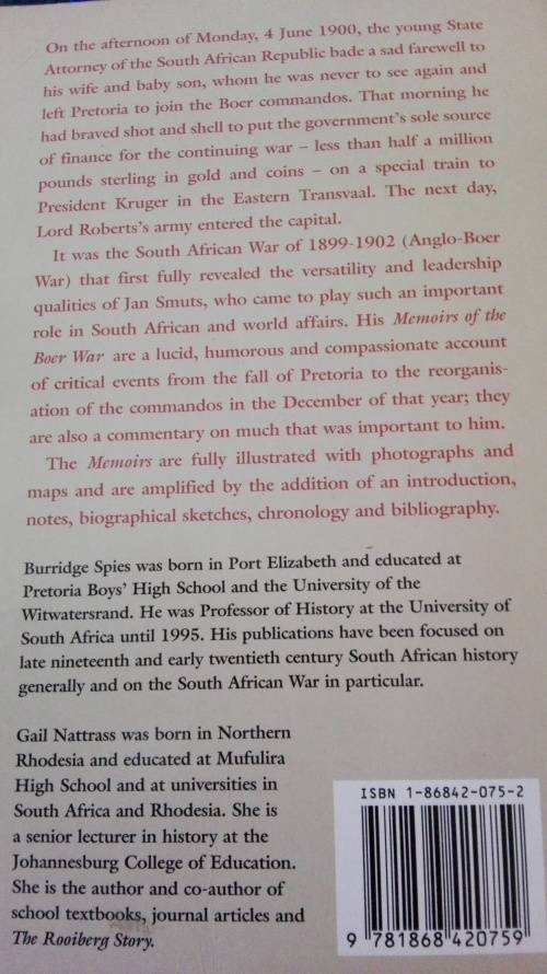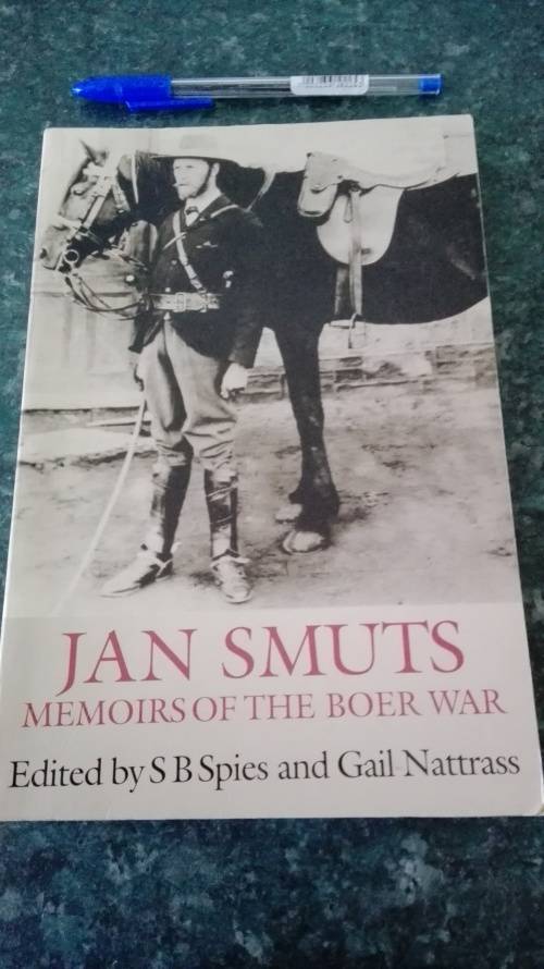 JAN SMUTS MEMOIRS OF THE BOER WAR Edited by S B SPIES and GAIL NATTRASS Published by Jonathan Ball Publishers Jhb. Softcover ISBN 1 86842 075 2 Originally published in hard cover in 1994 . This Softcover version published 1999.No of Pages ; 242 including the Index .