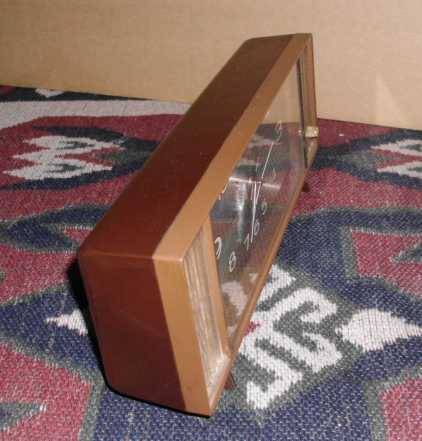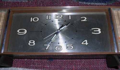 A Japanese, Tokyo-Tokei, 2 Jewels alarm clock. Measures : 29 x 12 x 6 cm. Works intermittently - starts and runs after being shook - will need to be serviced. Runs for 1 day on one wind. Plays an unkown tune on what sounds like a music box player when the alarm is set off. The front is cover for the clock face is made of glass.