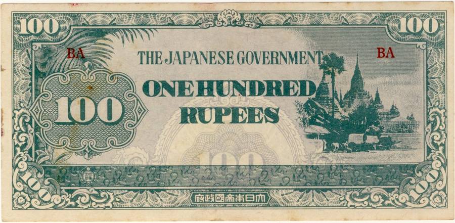 In 1943, the Japanese installed Dr. Ba Maw, an outspoken advocate for Burmese self-rule, as the head of the puppet government. From 1943 onward the Japanese issued paper script currency of 1, 5 and 10 Rupee with a 100 Rupee note in 1944. The Japanese characters in the oblong box at the bottom of each note read “Government of Great Imperial Japan” and the contents of the seal at the lower right of the comprise the Japanese symbol for the Minister of Finance.
