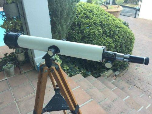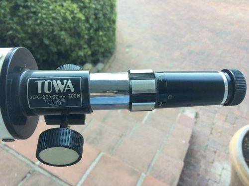 This fantastic Japanese made Towa 30x 90x60mm zoom "coated" telescope on a vintage wooden extendable tripod is a stunning find. The stand is in amazing condition for its age and the telescope works great. The lenses have protective covers and have no visible scuffs or scratches.