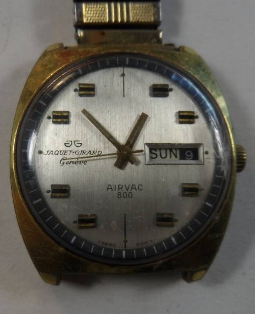 Jaquet-Girard Day/Date Airvac 800 Watch 13878. Not running, for spares/repairs, parts might be missing? Strap intact, but damaged. Watch has some wear/marks/scratches. Crystal damaged slightly scratched. Crown rotates, hands move, only day changes. Diameter of case excluding crown: 35mm. Movement marked: unable to open.