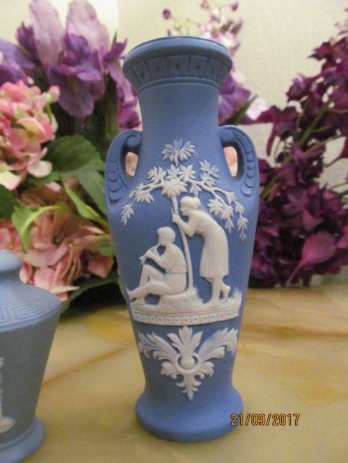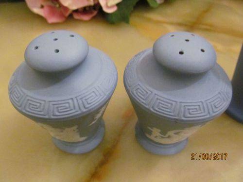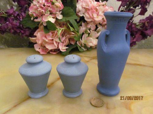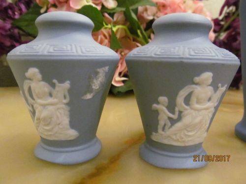 LOT OF FOUR COLLECTABLE PORCELAIN JASPERWARE WEDGWOOD ITEMS - TWO VASES & TWO SALT SHAKERS