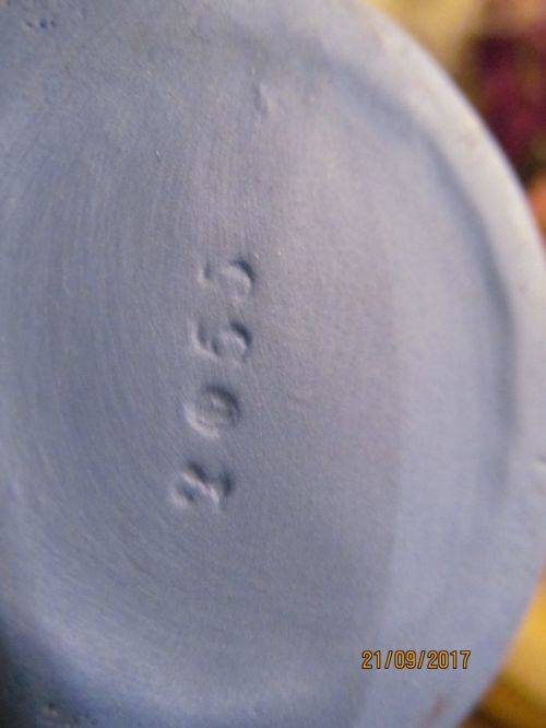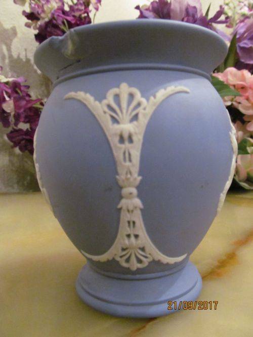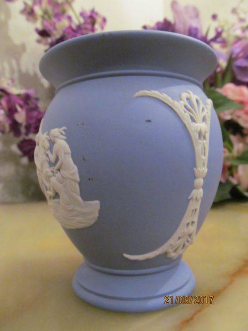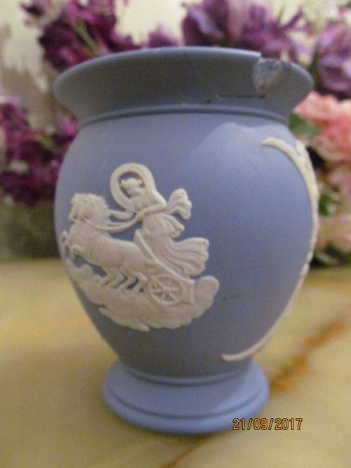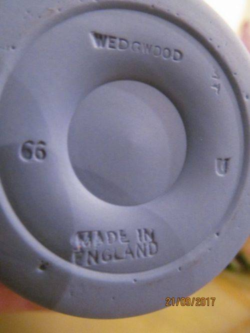 3)- A VASE DECORATED WITH TWO SEPARATE IMAGES AND A FLARED RIM. THE VASE IS STAMPED - "WEDGWOOD 65, MADE IN ENGLAND" THE ITEM HAS A CHIP ON IS RIM ASIDE FROM WHICH IT HAS NO CRAZING, CRACKS, DAMAGES OR OTHER CHIPS. 9.5cm HEIGHT.....5.5cm DIAMETER OF BASE......7.8cm DIAMETER OF RIM