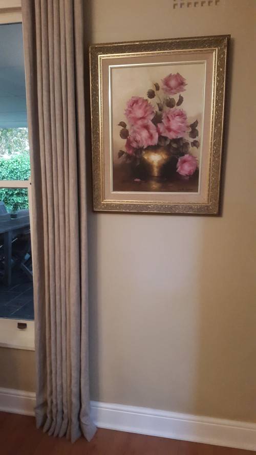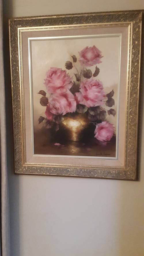 Lovely colours in this one, much better than her usual. Radiant pinks in the roses painted with clever technique. One of the best examples of her work that you will ever see.