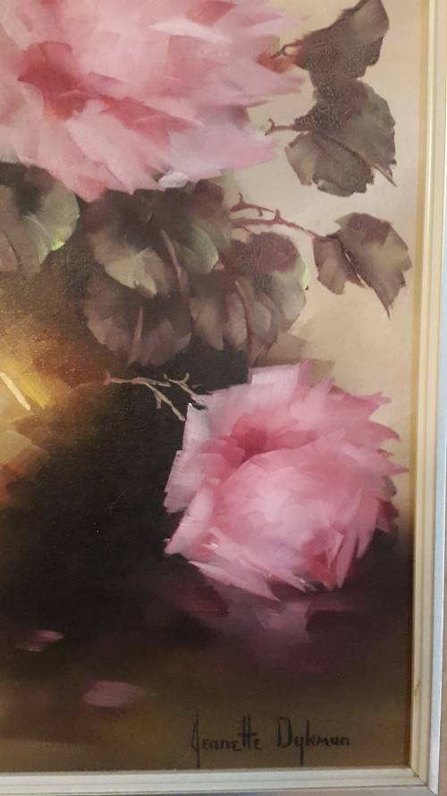 Both the artist's father John Dykman and uncle Henry Dykman were also flower painters who provided her with tuition but her technique is the best. Her speciality is roses. She has developed quite a following over the years. She is South African but at one point had a studio in La Jolla, San Diego, U.S.A..